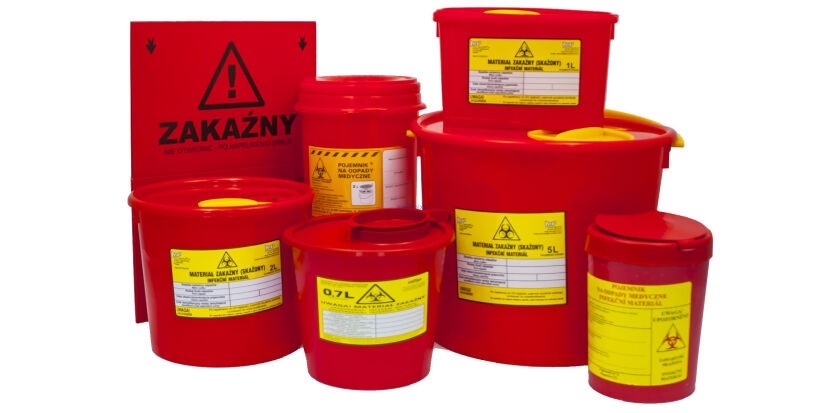 Pojemnik na zużyte odpady medyczne (strzykawki, wenflony, igły itp.) wykonany z tworzywa sztucznego (PP, PS, PE) podlegającego całkowitej utylizacji.