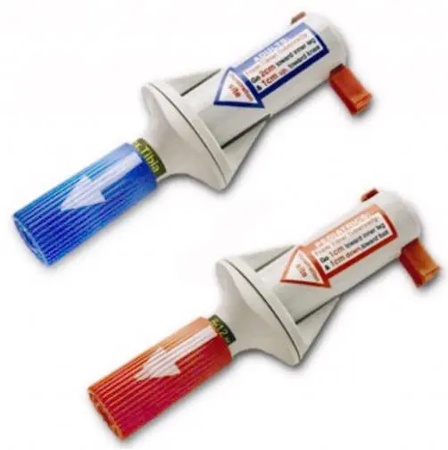 3. Zlokalizuj miejsce wkucia i ustal głębokość założenia na BIGu, trzymając swoją niedominująca ręką za czerwony lub niebieski cylinder przyłóż wkłucie do wybranego miejsca. Zachowując zasady aseptyki ustaw BIGa pod kątem 90st. do powierzchni ciała.